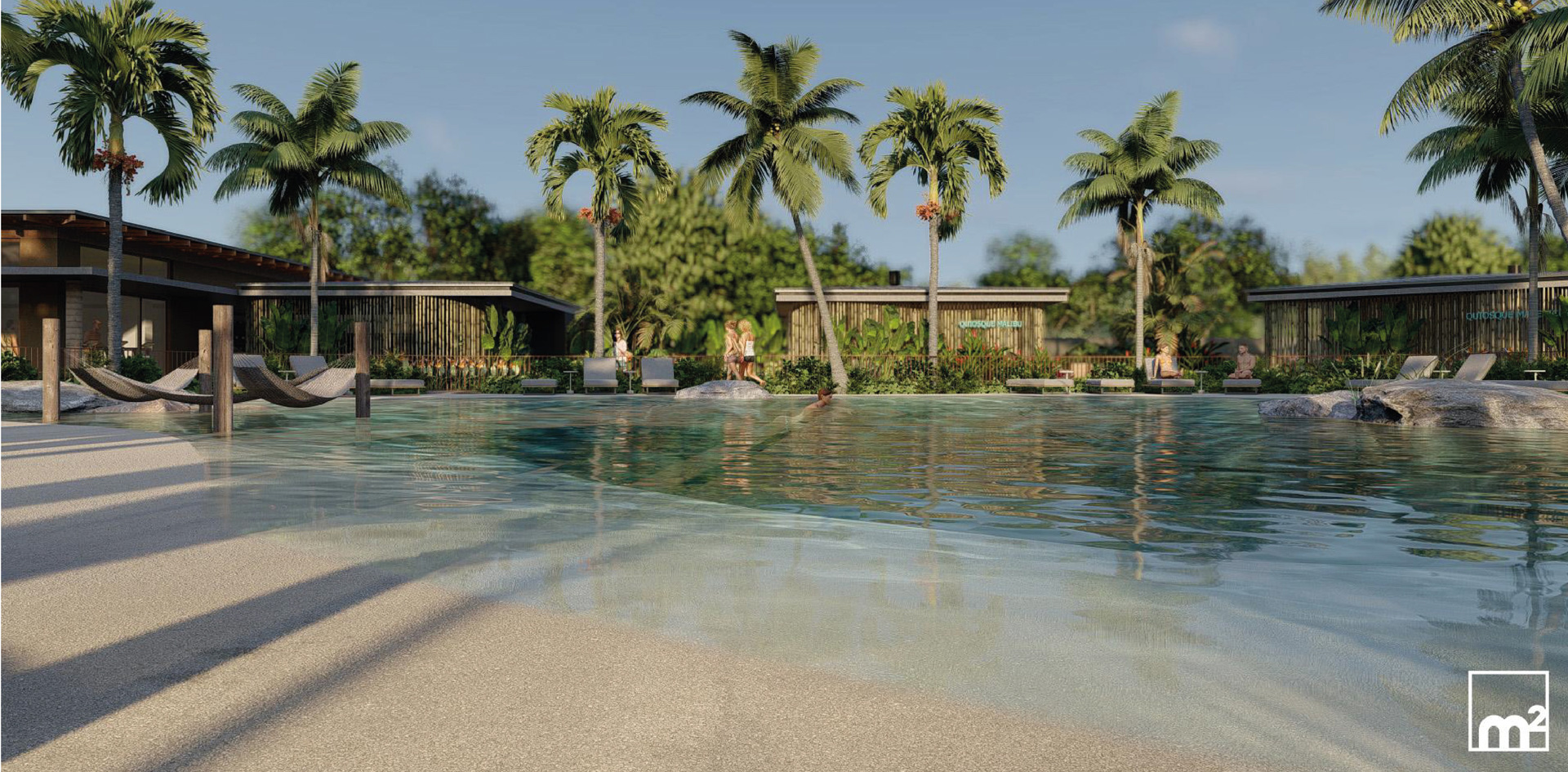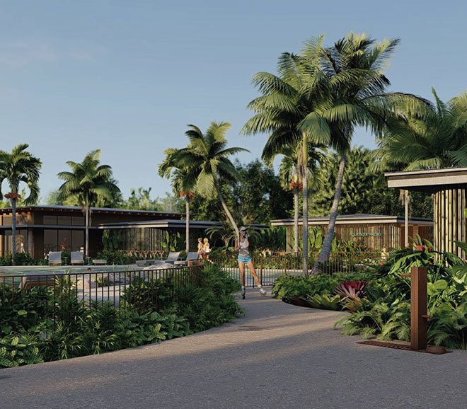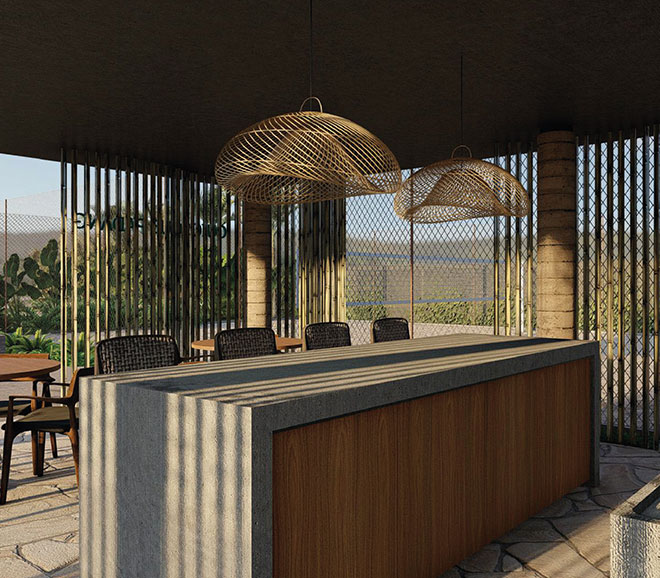 piscina com praia • salão gourmet • salão de festas • cinema • brinquedoteca • coworking • mini market • spa • sauna • academia • quadras esportivas • espaço pet • trilhas